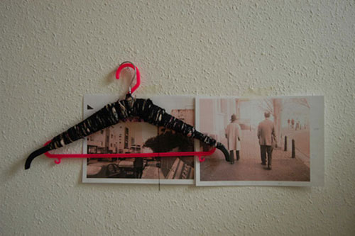 Title:i'm hanging on dearest You Material: Japanese silk thread, Italian synthetic cloth, used Japanese hanger, used unknown plastic hanger, Japanese nail polish, two sheets of ink jet copy i'm interested in my father's head, i made a song about it. "teppen ha-ge- teppen ha-ge- teppen ha-ge-yo-∞. a friend of mine took pictures in Tel-Aviv, there was one with a man who had little similar point of my father. Anyway, a hanger was broken, which was left by my mother. i attach an unknown hanger which i found in my flat. /Oct.06 |