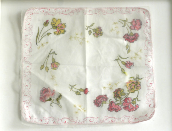 Title:For all mothers Material: Japanese silk thread, Italian synthetic cloth, cotton handkerchief with some holes i remember the day when i found the handkerchief in the market on 17.Juni strasse in Berlin. it was few weeks before stay in Tokyo. i wanted to prepare small German souvenirs for my girl friends. i tried to choose deadstock handkerschieves in one stand. My husband was hurried me, because my kid was bored by sitting in a stroller. so i should hurry to choose 10 from mountains of handkerchieves. i could not recognize one handkerchief had holes on the image of carnations. |