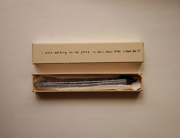 Title:i am walking on the piece Material: Japanese silk thread, Italian synthetic cloth, one pen which was found in Karl-Marx Allee i remember that it was rainy day, i was walking alon Karl Marx Allee, in order to go to copy shop. On the road i found a gray pen without cap. i pickt up it, covered with tissue, and brought it to home. |